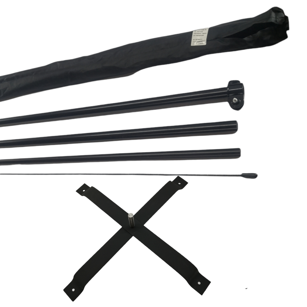 Debido a la altura de las banderas, se utiliza una base especial negra de acero esmaltado, con perforaciones para opción de anclaje. Y un pivote simple de 5/8 de diámetro x 8 cm de largo.
