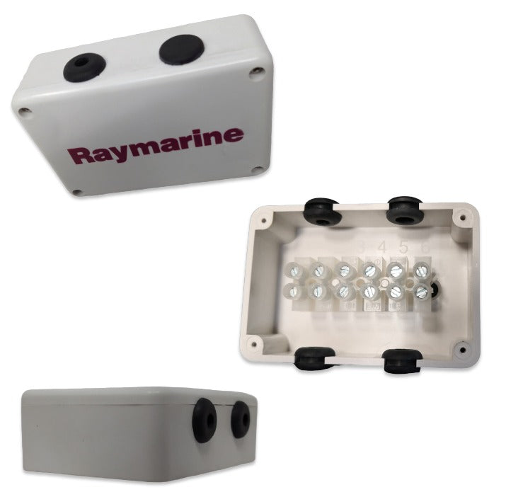 Caja de conexiones Raymarine con regleta de terminales, P / N RUL-4355-012-A. También se utiliza P / N D108. Tiene 4 puntos de entrada de cable con ojales y un bloque de terminales de 6 posiciones.