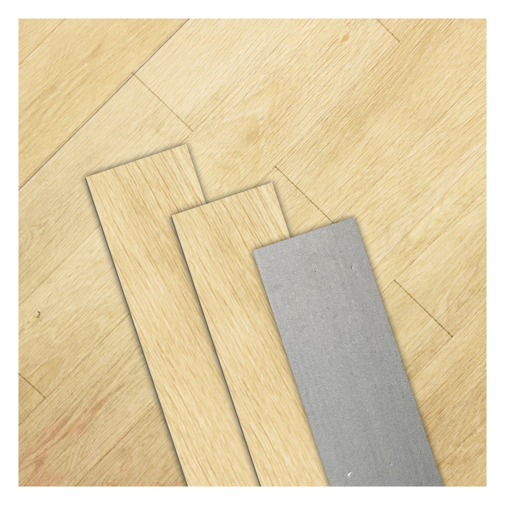 SPC (Stone plastic composite, piedra plastica compuestas. Composición: Piedra caliza pulverizada, PVC y aditivos. Acabado Madera)