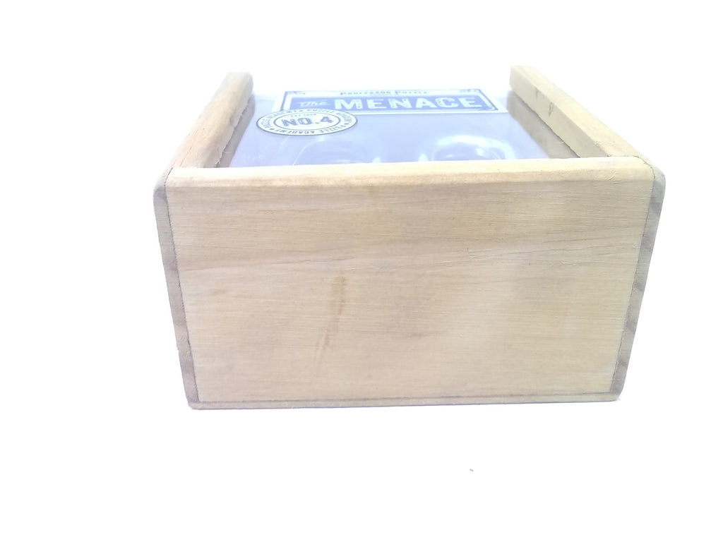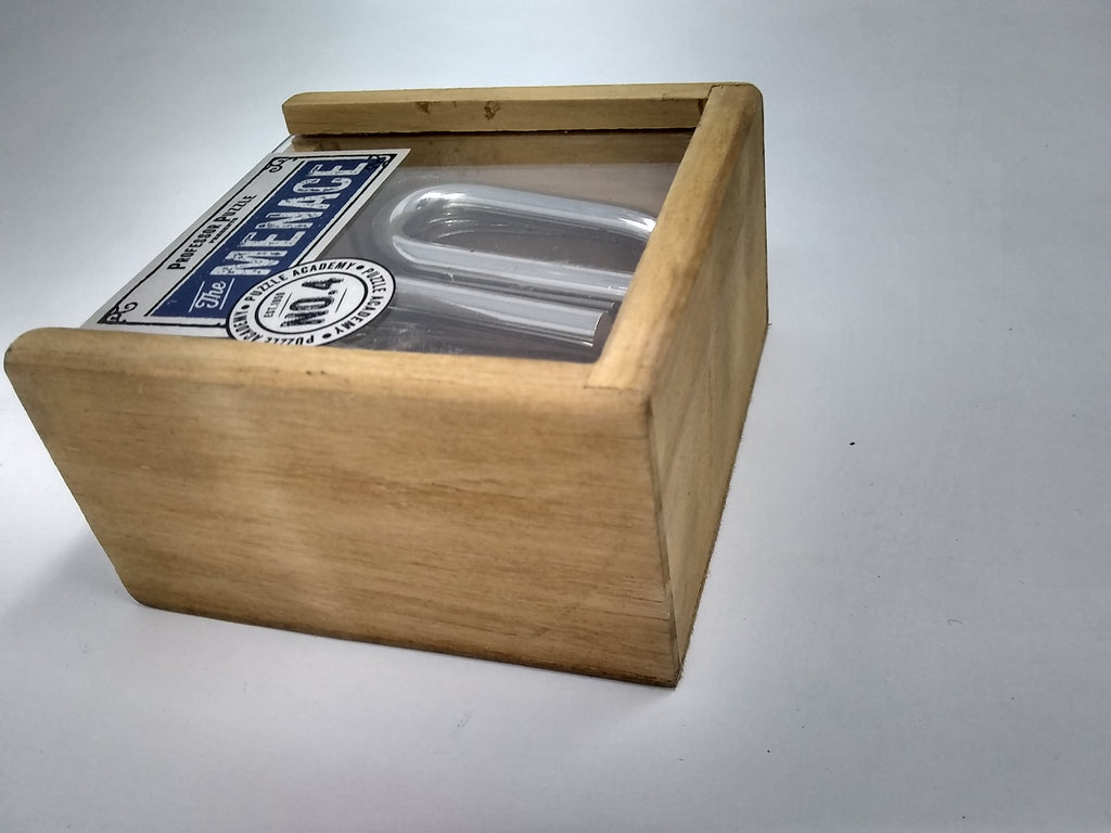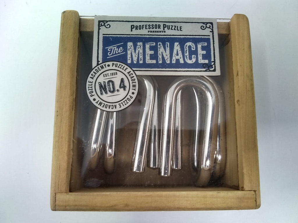 The Menace from Professor Puzzles es un rompecabezas sólido, macizo, de metal cromado. Hay dos piezas con formas idénticas que, cuando se manipulan y colocan cuidadosamente, se separarán con facilidad. El montaje es igualmente suave pero también complicado. El rompecabezas viene en una pequeña caja de madera de 3.5 x 2.5 pulgadas con deslizador de plexiglás de la parte superior. Gran enigma para las edades de 6 a 105 años. Difícil, pero no demasiado.