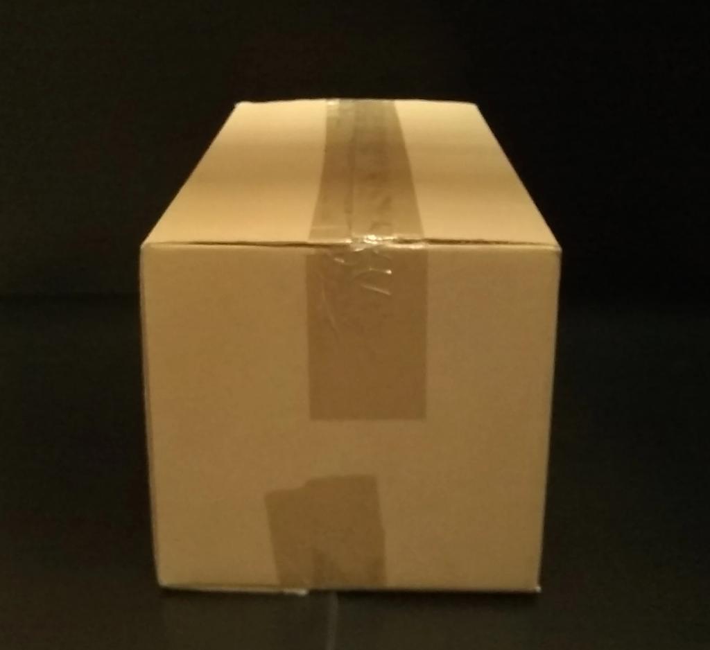 Caja rectangular de cartón USADA. Tiene una etiqueta en una cara lateral.
