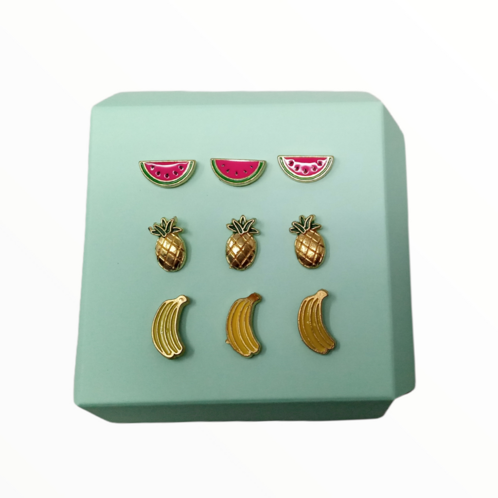 - Paquetes de 9 piezas con 3 pin de plátano, piña, sandia