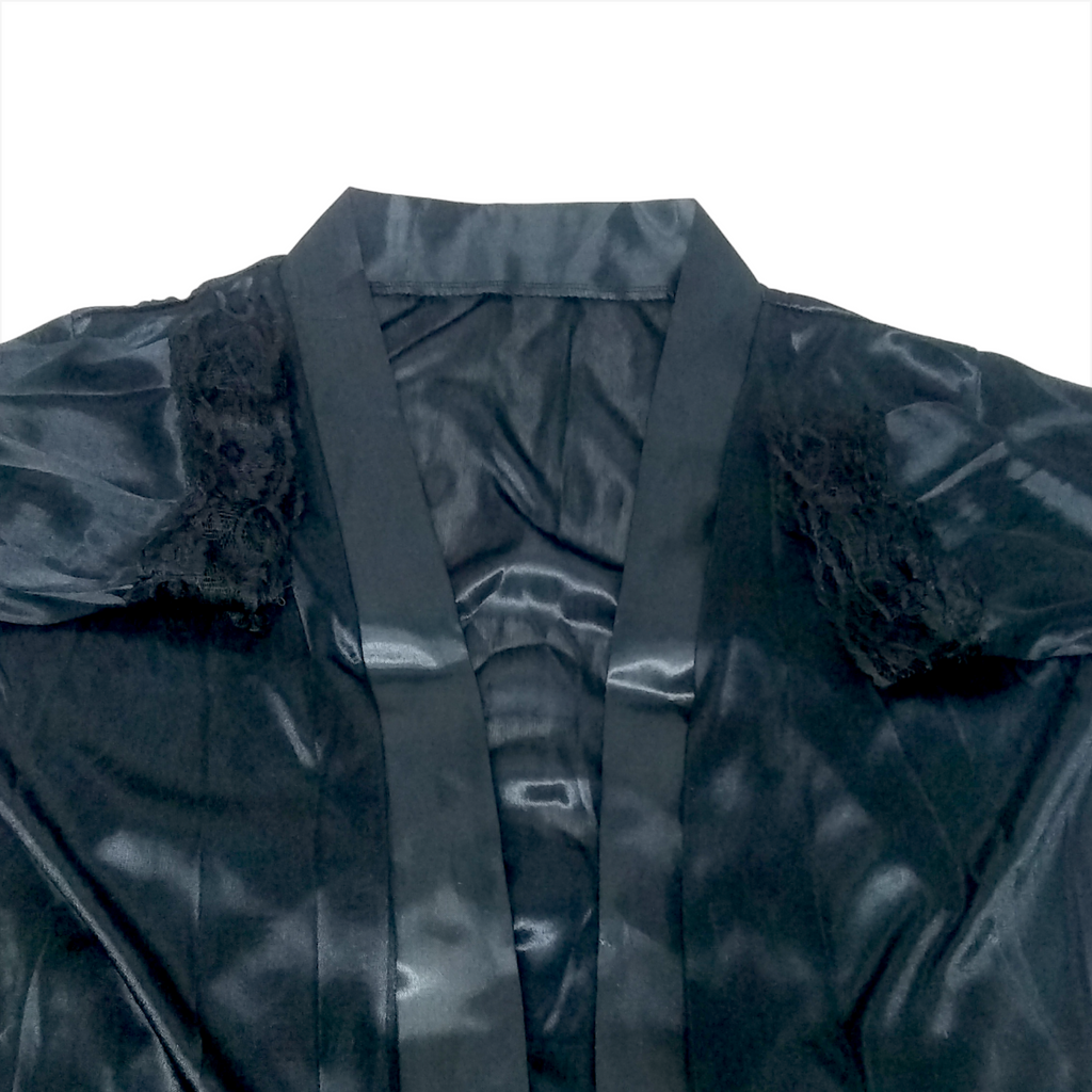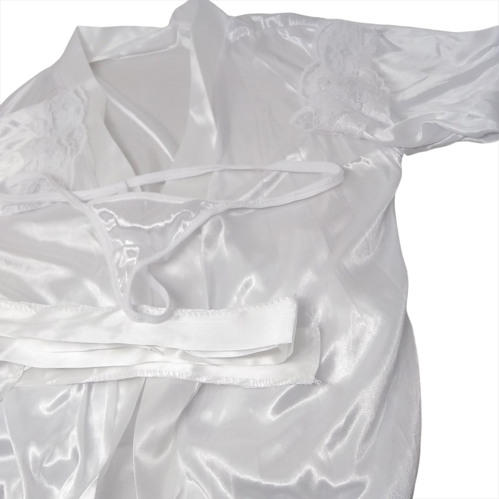 Juego de lencería bata súper sensual y elegante, corta con mangas anchas, detalles de encaje, lazo para la cintura y tanga a juego.