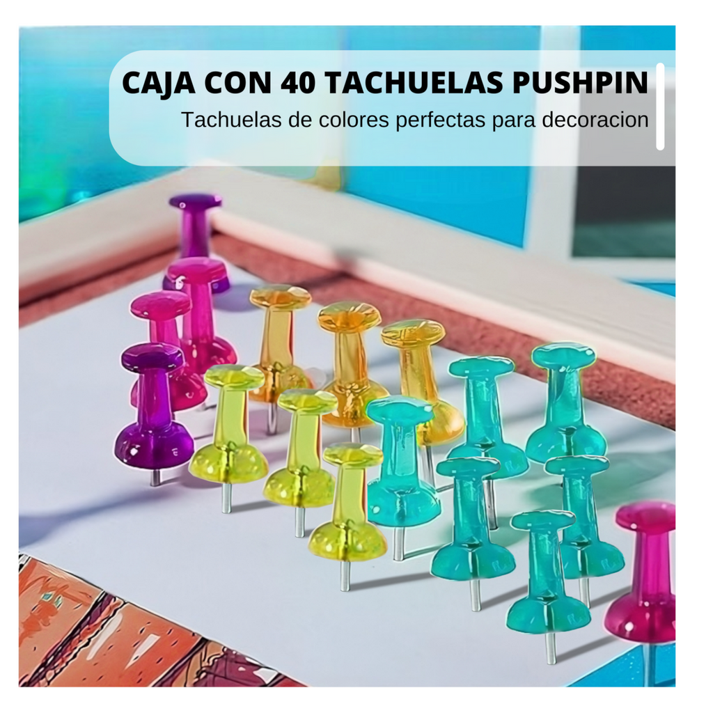 CAJA CON 40 TACHUELAS PUSHPIN. INVENTARIO DISPONIBLE PARA MAYORISTAS