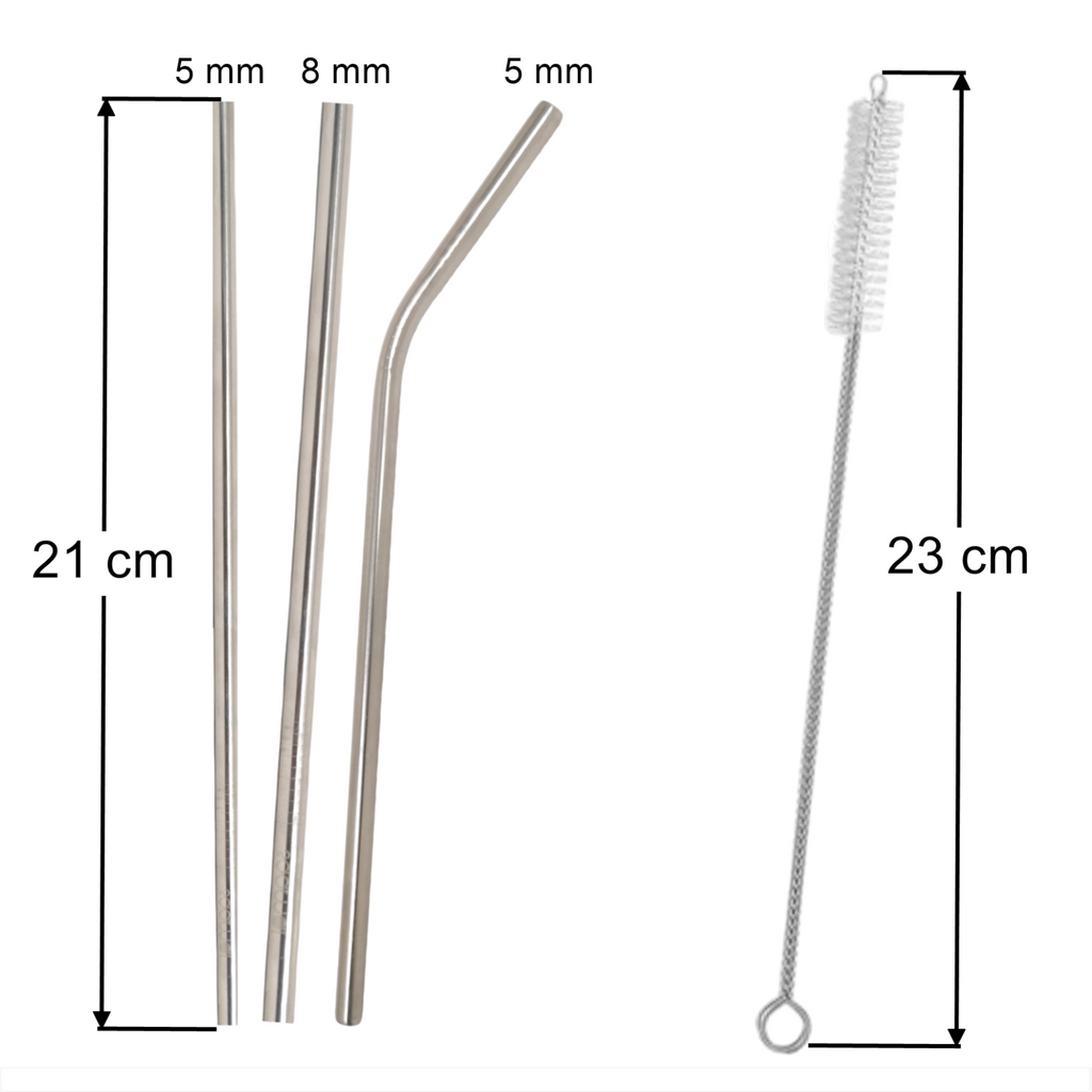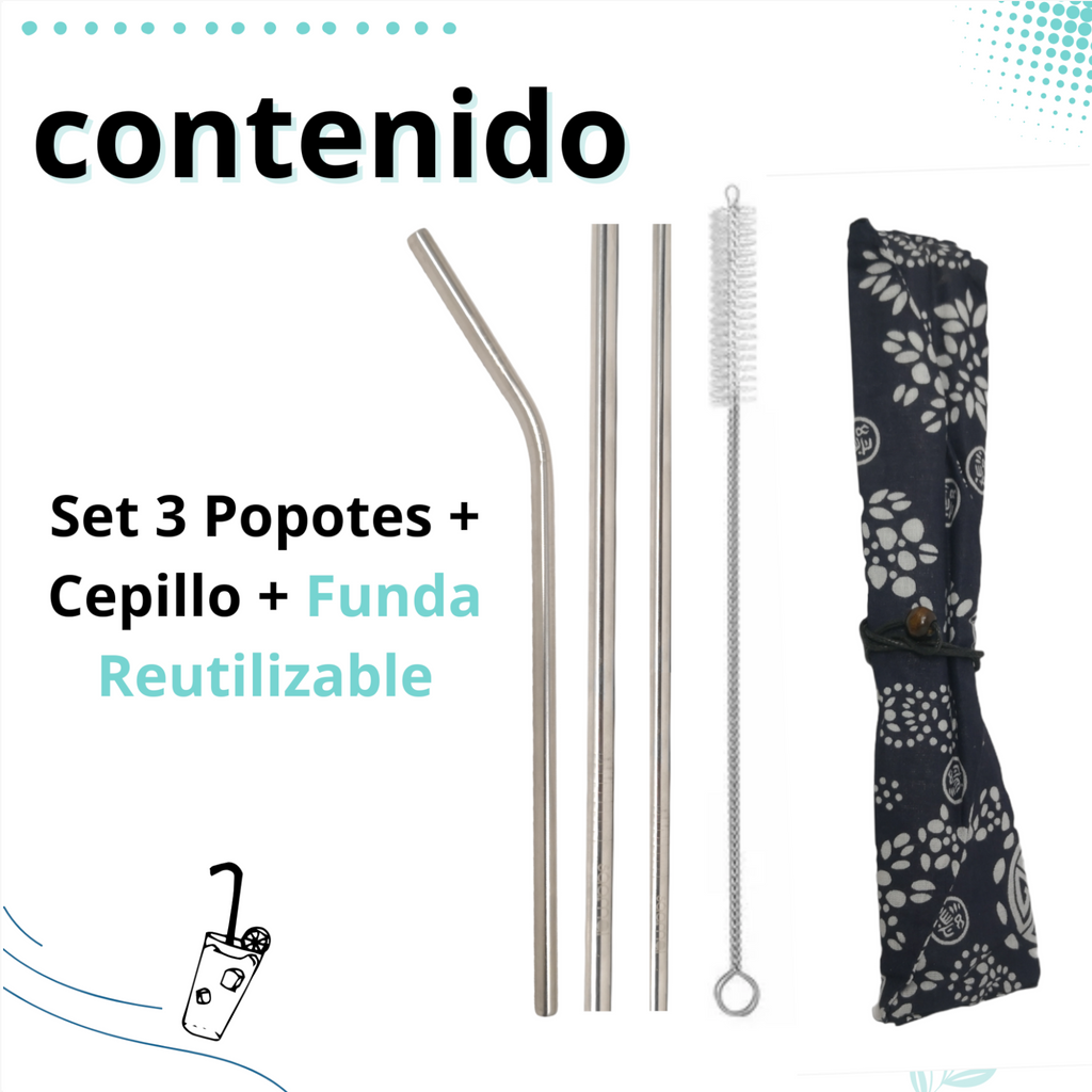 Set 3 Popotes + Cepillo + Funda Reutilizables Metalicos Ecologico